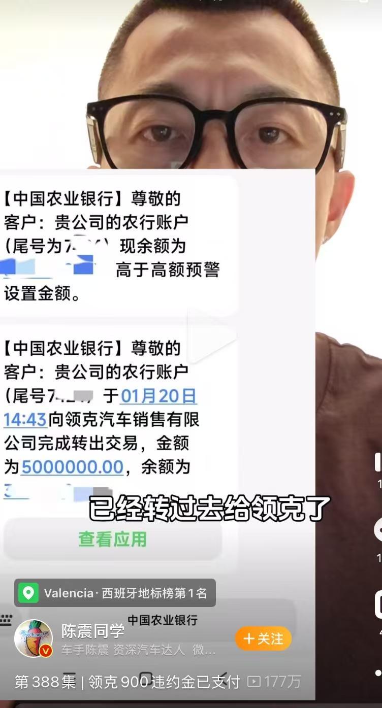 在视频中,陈震出示了来自银行的短信转账纪录,傲气为“贵公司的农行账户于1月20日14:43向领克汽车销售有限公司完成转出往复,金额为5000000”。